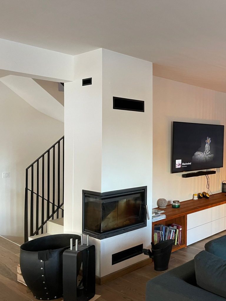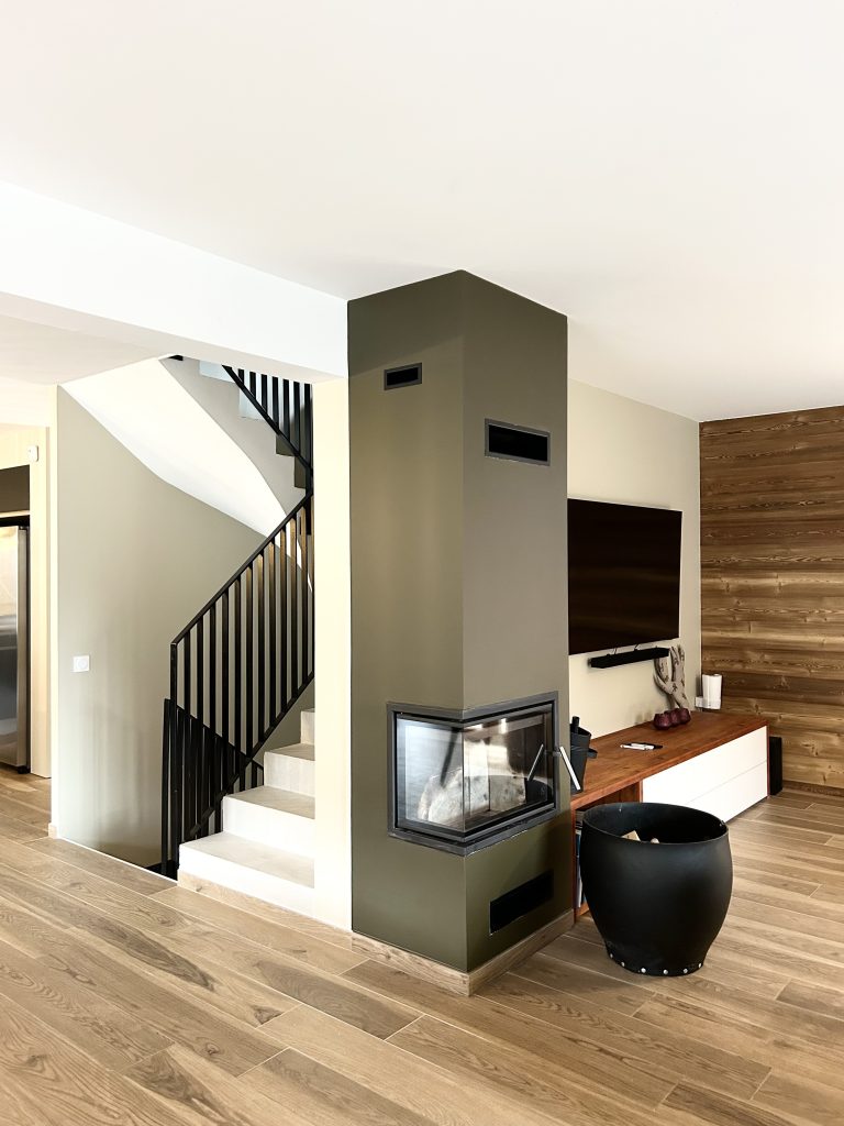 Dans le salon, la cheminée devient un point focal revisité : une couleur contrastée vient souligner son caractère, accompagnée d’un nouveau tapis qui renforce l’identité du lieu.