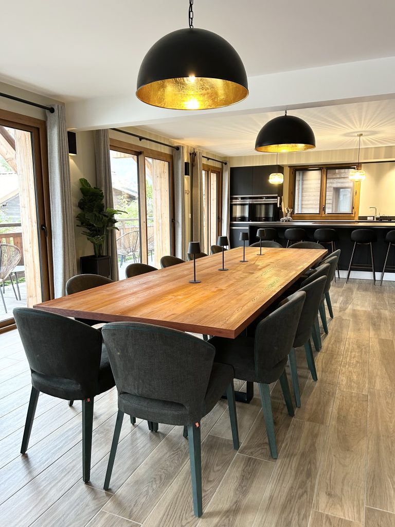 La salle à manger se voit quant à elle dotée de nouvelles chaises, plus actuelles et harmonisées avec le reste du chalet.