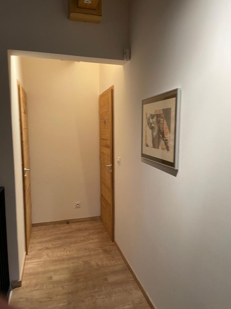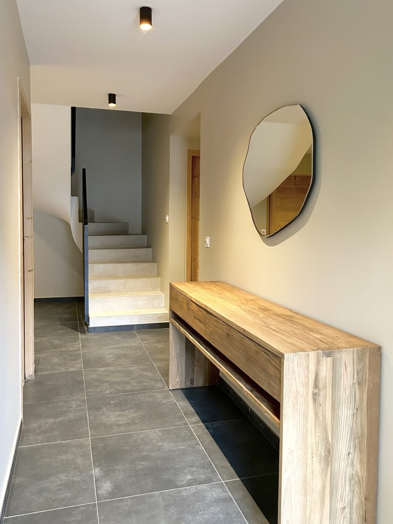 Dès l’entrée, l’atmosphère se transforme : une peinture soigneusement choisie habille les murs, tandis qu’une console en chêne et un grand miroir apportent fonctionnalité et caractère.